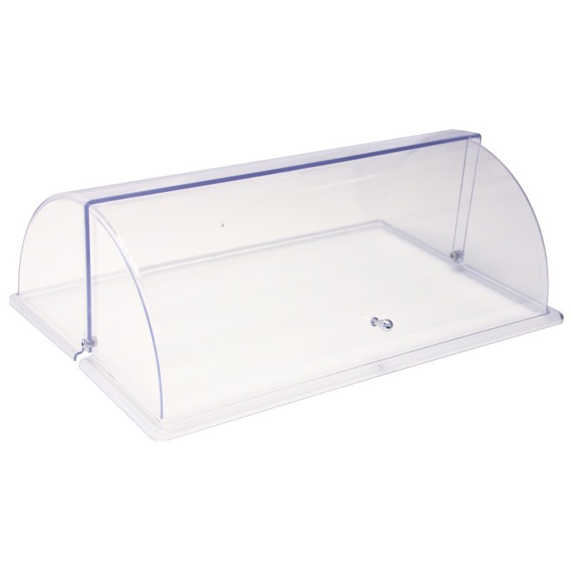 The Cadco C-DPF2-HD roll-top lid provides quick access to product in steam table pans because its rolling design frees a hand when multitasking or serving food. Its metal hinges resist corrosion for long-term use, and the clear material displays product while protecting it from contaminants.